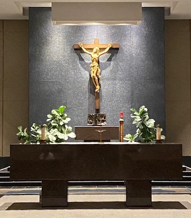 Later in the day we were gathered in the chapel for Adoration and Reconciliation. At the end of the Holy Hour I lingered for a few minutes as the others processed out. When I bowed to take my leave, I looked up at the crucifix behind the altar and froze in wonder. I took this photo so that I could share it with you.