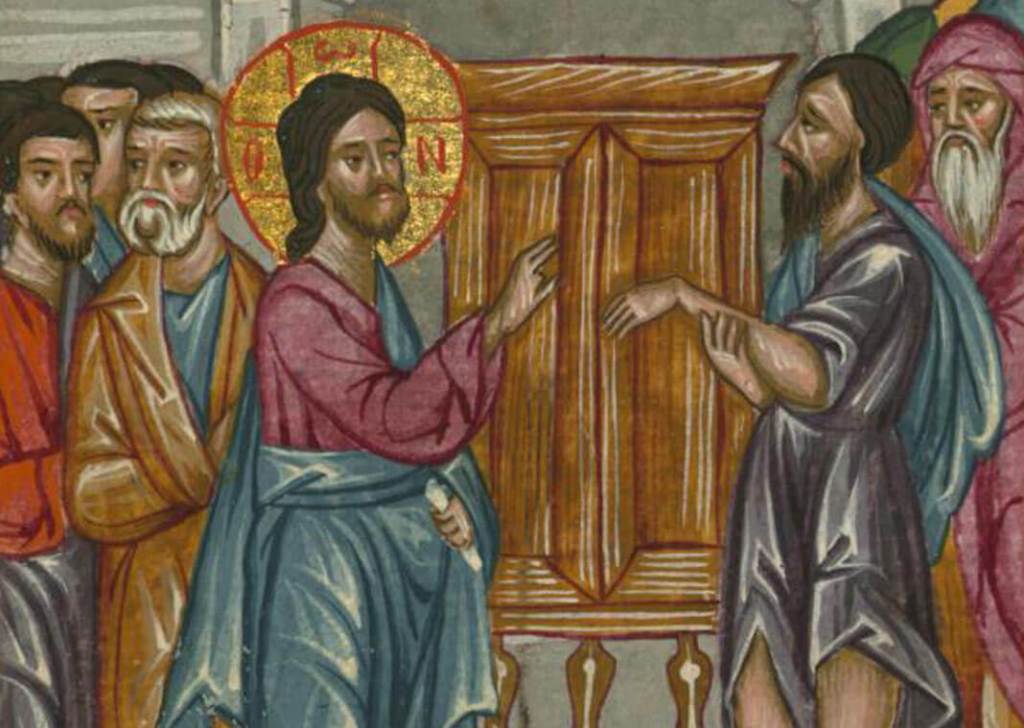 Jesus heals the man with the withered hand.